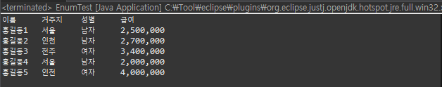 alist.add(new EnumTest("홍길동4", 2000000, EnumTest.Addr.서울, EnumTest.Gender.남자));